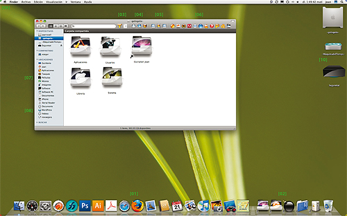 01. Aquí no hi ha cap secret, hi tinc les aplicacions que faig servir més sovint i està recolzat pel [09]. A l’esquerra hi tinc tot el tema del sistema, segueixo per l’edició i la imatge, els navegadors, etc…, miro de tenir-ho per temes. 02. A l’altra cantó del doc hi tinc àlies. Pel que fa a les descàrregues, no m’ha agradat la manera de resoldre aquest tema a Leopard. Si tens l’accés a vàries carpetes no queda clar quina és quina quan hi surt la imatge d’una icona aleatòria, en funció de l’ordre alfabètic del contingut de cada carpeta i prefereixo fer un clic a un àlies visualment clar i que s’obri la carpeta per afegir-hi, agafar-hi o obrir-hi arxius i capetes. També hi tinc un àlies de l’escriptori (igual que al primer nivell del disc dur), per accedir a ell quan tinc la pantalla plena de finestres obertes. És la manera més fàcil d’accedir-hi ja que l’escriptori se t’obre com una finestra més a primer pla. L’altra àlies (primer nivell del disc) em va bé per quan em connecto per xarxa amb l’ordinador (no amb la carpeta d’usuari) i vull accedir a l’escriptori; sinó has d’anar a usuaris/usuari/escriptori. La bomba i la carpeta són carpetes personals d’accés ràpid i la nevera és un congelador d’arxius. Aquí poso arxius en quarentena abans de llençar-los. De fet amb la màquina del temps ja no té gaire sentit aquesta carpeta però és una seguretat més ja que la màquina del temps fa còpia cada dues hores i avegades hi ha arxius intermitjos (per generar un resultat final), que la seva vida és més curta de dues hores i segons com es poden trobar a faltar. 03. Aquí tinc la gestió de les tipografies per poder accedir-hi fàcilment. La T groga és la carpeta de fonts de la llibreria (on hi tiro directament les fonts perquè es carreguin) i la icona del costat el magatzem de fonts (a on les vaig a cercar). 04. Al costat de les fonts hi tinc els servidors locals i remots. Per aquestes icones hi accedeixo per afp per deixar-hi arxius o prendre’ls. Si hi vull accedir per interactuar-hi faig servir l’ARD (Apple Remote Desktop). 05. Al costat d’aquests hi ha els ordinadors de la xarxa. Hi clico quan vull accedir a un d’ells i m’estalvio un clic com a mínim (sinó haig d’anar a ubicació i triar l’ordinador que vull. Aquest és un altre inconvenient de Leopard, abans amb Tiger, malgrat no poder compartir pantalla, tot era en general més àgil). Aquesta foto de pantalla és de l’ordinador de casa i hi tinc el portàtil i els dos ordinadors de la feina que fan de servidors. A la feina com que en tinc onze hi puc accedir ràpidament, els tinc amb la icona de cada model i va força bé. Allà també hi tinc posades les icones dels discos durs externs. Totes les icones de màquines que són a la xarxa són àlies ja que si tinc els originals quan no hi ha connexió em sutirien interrogants. La gràcia de l’invent és que com que sempre o quasi sempre tens una finestra oberta l’accés és immediat. Seguim 06. Aquí tinc tot el software ordenat per temes. Les primeres quatre icones són per la carpeta d’aplicacions del sistema i les altres tres per programes d’edició i disseny, la següent per programes d’utilitats vàries, l’altre pel software de xarxa, l’altre per programes d’Apple (de programes que no tenen actualitzacions ja que tot el software d’Apple, perquè s’actualitzi ha d’estar a la carpeta d’aplicacions original), l’altre per tot el que fa a les impresores, l’altre per tipografies, l’altre multimèdia i la última és un àlies de la carpeta utilitats del mateix sistema. 07. Aquí hi tinc publicades totes les carpetes que hi ha dins de l’usuari i al 08. els accessos directes a blocs i pàgines web que tinc a l’ordinador (no depenc de cap hosting, qualsevol dia d’aquests ja us ho explicaré) i també hi poso carpetes de treball de manera temporal per accedir-hi ràpidament des de qualsevol finestra o des del menú obrir de qualsevol programa. Aquestes quan he acabat la feina les trec de la barra lateral, les esfumo. Uf, ja acabem, 09. Això és un programa que ja fa molts anys que el tinc i que no he trobat cap programa més senzill que faci la seva funció, es diu MaxMenús i només l’utilitzo per programar les tecles de funció F1 a F8 per tenir accesos directes per obrir programes o passar d’un programa a un altre, els més comuns per a mi (més rapid impossible). Ho vaig provar de fer-ho per veu amb el panell de control parla, però la meva pronúncia de l’anglès és molt macarrònica i no ens entenem amb el meu Mac. 10. La seguretat. Tinc la màquina del temps que em guarda tot el que faig i tot el que he fet i he esborrat, fins a sis mesos, i un disc amb mirror per guardar-hi tot el que vaig fent i vaig arreplegant amb els anys i vull conservar. No acostumo a guardar material en CD’s, ho tinc tot sempre viu per poder trobar-ho el més ràpid possible.