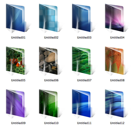 Us deixo un arxiu zip amb les icones de la il·lustració. És un botó de mostra del que vindrà. Són 12 carpetes de temes i estan fetes amb temes de fons de pantalla del mateix Leopard i tenen d’especial que són de màxima resolució 512×512 pixels. Estic preparant les horitzontals que les dividiré amb carpetes del sistema i carpetes d’utilitats. M’en falten un parell o tres per acabar les col·leccions.