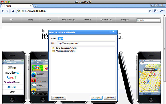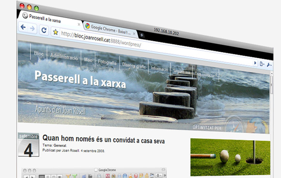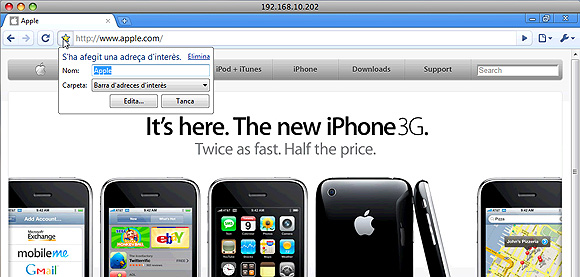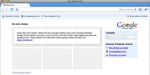 El primer que t’ensenya és una finestra on hi haurà les pàgines més visitades, per així estalviar-te temps en clicar als favorits i tenir-les a primer pla (això és nou o almenys jo no ho havia vist mai). El que potser sobte més és que només hi ha una casella on posar l’adreça de la pàgina que t’interessa anar o per posar la informació i paraules clau per fer una recerca a internet, clar és Google. També m’he entretingut a fer una comparativa entre aquest navegador i el WebKit de Safari. Us deixo la pel·liculeta perquè pogueu comparar. Hi he posat pàgines que mai abans havia visitat per assegurar que la caché no dongui avantatge a Safari. També he clicat primer al nou nat perquè durant dècimes de segon tingués més ampla de banda.