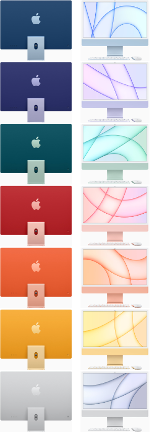 El dia 20 d’abril Apple va presentar un iMac de 24” completament nou amb un gruix de només 11,5 milímetres i en 7 colores diferents per a triar (blau, lila, verd, taronja, vermell, groc i gris metàl·lic). La pantalla és de Retina de 4.5K, amb 11.3 mil·lions de píxels, 500 nits de brillantor i més de mil millons de colors. El nou iMac també renova la càmera integrada de 1080 pixels, micròfons amb qualidad d’estudi i un sistema de so de sis altaveus. També integra per primera vegada, Touch ID, el que fa que sigui més fàcil iniciar sesió, realitzar compres amb Apple Pay o canviar de perfil d’usuari només amb la teva emprempta.